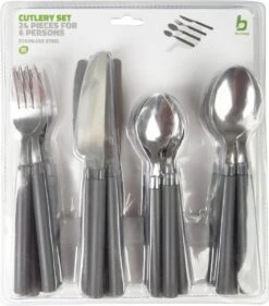 Een stevige 24-delige bestekset. Deze praktische set is geschikt voor 6 personen en bestaat uit 6 messen, 6 vorken, 6 lepels en 6 kleine (thee) lepeltjes. Gemaakt van roestvrij staal met een kunststof heft en de set heeft hierdoor een lange levensduur. Verpakt in een stevige blister.