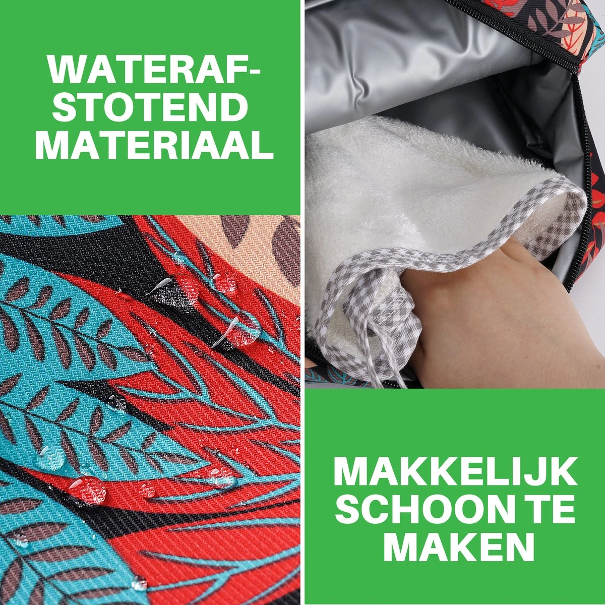 De buitenkant van de koeltas is slijtvast en gemaakt van hoogwaardig materiaal. Bovendien stoot het materiaal ook water af zodat je eten en drinken niet nat worden tijdens een onverwachte regenbui.