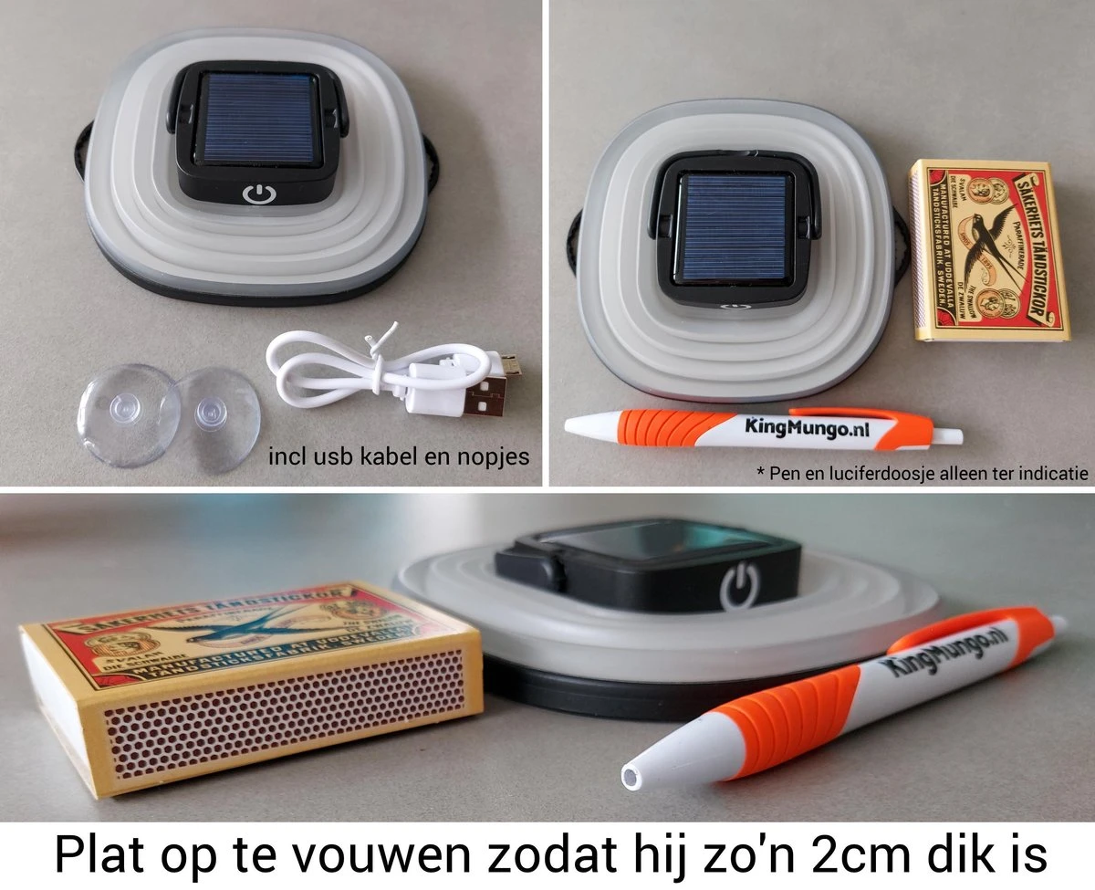 Solar Led Camping Lamp: Opvouwbare tafellamp oplaadbaar, de ideale kleine compacte lichtgewicht solar lamp voor op de camping. Plaats hem op je campingtafel in de voortent, of hang deze campinglamp op. Deze led solar lantaarn kun je opladen dmv zonneenergie of via een een USB kabel, duurzaam oplaadbaar op 2 manieren dus.